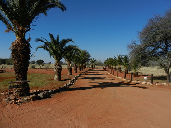 Rechterhand erblicken wir plötzlich eine grosse Salzpfanne und in der Weite mehrere Oryxantilopen. Auf der linken Seite ist die Abzweigung zu unserem heutigen Hotel, der Anib Lodge. Die Zufahrtsstrasse geht in roten Sand über und wir fühlen uns wie im australischen Outback. Plötzlich säumen Palmen die Strasse und bringen uns zu einem wunderbaren Platz. Unter hohen Bäumen finden wir die schöne Anib Lodge. Die herrlichen Farben der grünen Bäume und des roten Sandes begeistern uns. Und mitten drin eingebettet liegt die Lodge.