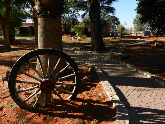 Die ganze Anlage ist weitläufig mit Swimmingpool, Liegestühlen, Kaktusgarten, offenem Restaurant und Bar. Unsere Cabins liegen etwas ausserhalb der Anlage mit einem eindrücklichen Blick in die Kalahari Wüste. Unsere Zimmer sind gemütlich eingerichtet, selbstverständlich mit einem Moskitonetz über dem grossen Doppelbett. Es gefällt uns gut!