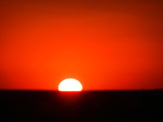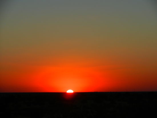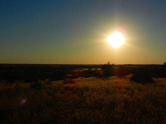 Als wir die Salzpfanne verlassen, führt uns Bart auf hohe tiefrote Sanddünen hinauf. Dort befinden sich die anderen Wagen und die Fahrer haben bereits einen grossen Tisch mit Getränken und Snacks aufgebaut. Es ist Sundowner-Zeit! Auf diese afrikanische Touristentradition freuen wir uns schon lange. Jürg schnappt sich ein Bier und ich mir ein Glas Wein, dann geniessen wir den wunderbaren Anblick der versinkenden Sonne. Von Gelb wechselt sie in Orange, dann in Tiefrot und versinkt als brennender Ball am Horizont. Der rote Sand der umliegenden Dünen leuchtet wie wenn sie brennen würde. Es ist unglaublich schön!