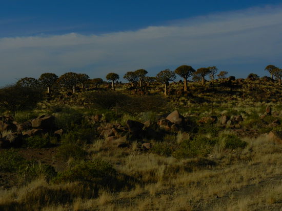 Nach einer Fahrt von ungefähr drei Stunden erreichen wir wieder die ersten Zeichen von Zivilisation, die ersten Häuser von Keetmanshoop. Vor der Stadt biegen wir ostwärts auf eine unbefestigte Strasse ab und nach ein paar Kilometern erreichen wir die ersten Ausläufer des berühmten Köcherbaumwaldes. Dieses Gebiet ist einmalig und steht seit 1955 unter Naturschutz. Der einzigartige Baum ist eigentlich kein Baum sondern gemäss Reiseführer eine Aloen-Art. Die Pflanzen wachsen fast immer in den hier typischen schwarzen Felsen, können bis zu 8 Meter gross und 200 Jahre alt werden. Nach 20 - 30 Jahren beginnen sie in den Monaten Juni und Juli zu blühen mit langen gelben Blüten. Sie überstehen nicht nur die grosse Hitze sondern auch die Frostnächte der Wintermonate. Und sie sind höchst fotogen!