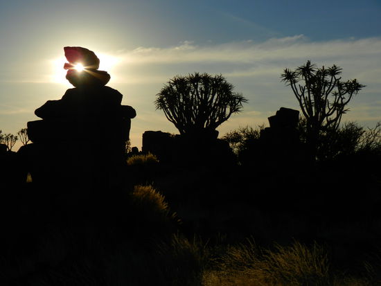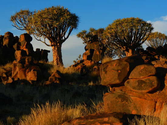 Das lassen wir uns natürlich nicht entgehen! Es ist ein wundervoller Ort und die untergehende Sonne verwandelt alles in ein malerisches Licht. Wir klettern kreuz und quer über Felsen um die schönsten Köcherbäume als Fotomotiv zu finden. Aber immer schön vorsichtig! Wir sind uns nicht sicher, ob alle Schlangen wissen, dass nun Winterschlafzeit ist. Die Felsen sind sicher ein beliebter Ort für alles was kriechen kann...