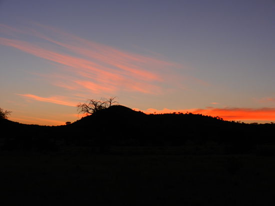 Ein kühler Morgen erwartet uns. Die Sonne ist grad am Aufgehen als wir vor unser Cabin treten und das Erwachen der Kalahari beobachten. Wir machen uns zu einem Spaziergang auf. Die aufgehende Sonne verwandelt die Natur in herrliche Farben. Der rote Wüstensand leuchtet strahlend unter dem Grün der Bäume und das blonde Gras der Savanne sieht aus wie goldenes Haar.