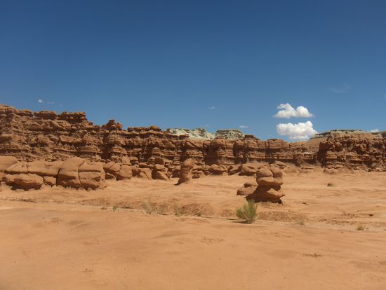 Morgens haben wir uns die Morgenattraktionen im Arches Nationalpark angeschaut und dann fuhren wir weiter Richtung Bluff, von wo aus wir am nächsten Tag das Monument Valley besichtigen wollten. Auf der Fahrt besichtigten wir den Newspaper Rock, der seinem Namen mehr als gerecht wird. Es handelt sich dabei um Piktogramme die in eine Schicht aus Cyanobakterien gemeißelt wurden (Übrigens habe ich im vorbeigehen im Bryce Canyon gehört, dass ein Ranger meinte Cyanobakterien seien eine Kreuzung von Pflanzen und Tieren, wieder was gelernt , nee eigentlich ziemlich traurig). Doch zurück zum Newspaper Rock. Man kann dort auch die Klimaveränderungen in den Piktogrammen erkennen, da in der Mitte sich das "Gespräch" zum großen Teil um Bären drehte (Fußabdruck), am Rand, wo die Cyanobakterienschicht nicht mehr so dick war hauptsächlich um das immer mehr arider werdende Klima (Sonne, am Ende sogar eine Sonne, die aus zwei Sonnen bestand). Weiter ging es zum Südeingang der Canyonlands, hier gibt es Formationen die aussehen wie Nadeln- sehr hübsch. In Bluff angekommen gab es ein fürchterliches Gewitter, dass sogar der Strom zeitweise ausgefallen ist.