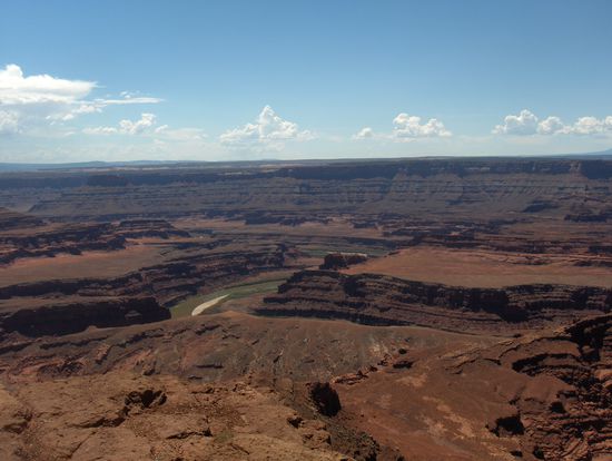 Da wir schon Teile vom Arches Nationalpark am Tag zuvor gesehen hatten, fuhren wir am nächsten Tag zu den Canyonlands und dem Dead Horse Viewpoint. Diese beiden Parks zeichnen sich dadurch aus, dass sie wie ein Grand Canyon in klein sind; dadurch kann man den Colorado noch sehen, wozu man im Grand Canyon kaum die Möglichkeit hatte. Abends wollten wir in den Canyonlands im Colorado schwimmen gehen, nachdem wir uns allerdings die Strasse angeschaut hatten, die in Serpentinen eine Wand von ca. 80% Gefälle runterging (auf dem Foto sieht es harmloser aus als es war), haben wir diesen Ausflug spontan gecanceled und den Tag gemütlich im Brauhaus von Moab beendet.