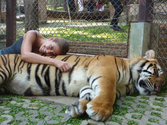 Gleich am ersten Tag besuchten wir den "Tiger Kingdom". Euer Entsetzen über eine artgerechte Tierhaltung oder über Sinn und Unsinn solcher Anlagen könnt ihr euch sparen. Wir sind uns dessen bewusst, gemacht haben wir es trotzdem Es ist halt schon interessant und auch nervenaufreibend sich zusammen mit einem Tiger im selben Käfig aufzuhalten, diesen zu streicheln oder daneben zu liegen.