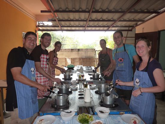 So musste mich Jasmin am Morgen regelrecht aus dem Bett boxen ( sie wusste nun ja wie das geht...) um rechtzeitig beim Kochkurs zu sein. Dieser Tag sollte ebenfalls ein Highlight werden. Mit viel Humor führte uns die Kochlehrerin in die Welt der Thai-Küche ein. Insgesamt fünf Gänge konnte jeder selber kochen. Und geschmeckt hat's dann auch noch super! Falls sich jemand mal selber davon überzeugen möchte ist er natürlich herzlichst eingeladen. Gerne kopieren wir die Rezepte für euch