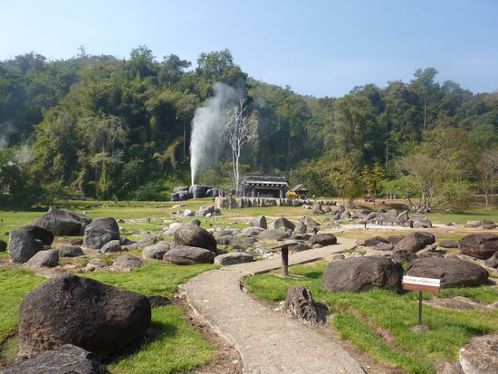 Den Weg nach Chiang Rai entschieden wir selbständig mit dem Auto zurückzulegen. Nachdem es einige Minuten gedauert hat bis ich mit dem thailändischen Verkehr zurechtkam, kurvte ich bald wie ein Einheimischer durch die Gegend, nur etwas schneller Zwei Tage sollte der Trip dauern und uns zu einem der wichtigsten Tempel Thailands, zu einer heissen Quelle, zu einer tiefen und dunklen Höhle und in viele abgelegene Berge und Dörfer bringen. Ein Wunder konnte unser Mitsubishi alle Berge bewältigen, die Streif in Kitzbühel ist ein Kindergeburtstag dagegen. Ein Elefantencamp haben wir ebenfalls besucht, waren zum Reiten auf den Dickhäutern aber zehn Minuten zu spät. Den Besuch bei einem Wasserfall machten uns hunderte von Mücken und anderen Insekten zunichte. Trotz zweimaligem Eincremen mit Anti-Mücken-Mittel fühlte man sich wie in einem Mittelpunkt eines riesen Schwarmes, was dann sogar mir zuviel wurde. Schade eigentlich. Der Weg führte mitten in den Regenwald und schien seit Jahrhunderten nicht mehr begangen worden zu sein. Übernachtet haben wir mitten im nirgendwo. Das Banai Resort sollte uns für eine Nacht unterbringen. Nachdem wir uns ziemlich hilflos nach etwas ess- und trinkbaren umgesehen haben, kam uns unverhofft ein Franzose entgegen. Dieser arme Kerl liess sich vor wenigen Tagen von seiner zweiten thailändischen Frau scheiden und scheint nun in diesem Dorf endgültig sein Glück gefunden zu haben. Kleine Anmerkung: für die Kleinigkeit von etwa 25'000 Euro hätte auch Nummer 2 seine Liebe nochmals erwidert. Auch von dieser Stelle nochmals viel Glück mit Nummer 3 und vielleicht etwas weniger Naivität