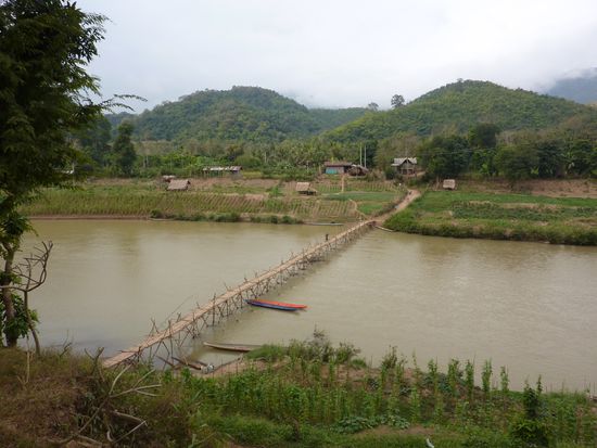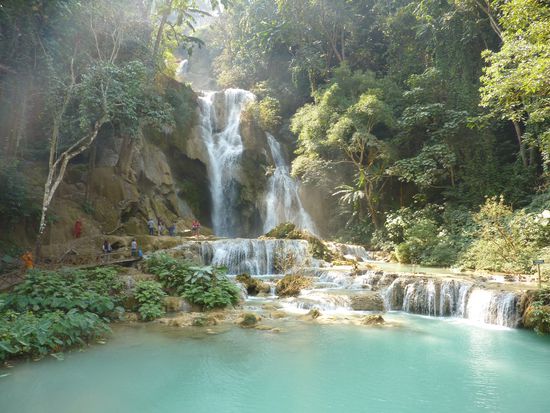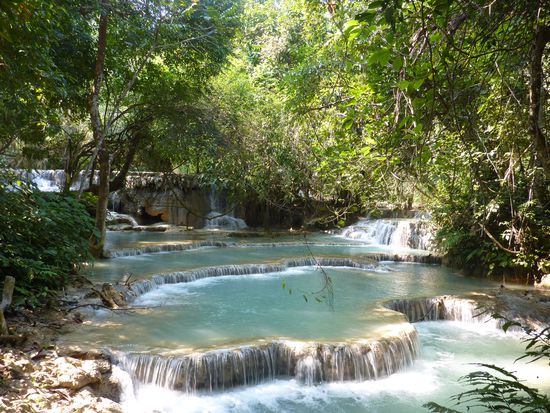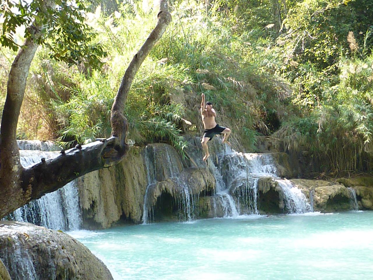 So begaben wir uns morgens zu Fuss zur Bootstelle um rechtzeitig unser Slowboat zu erwischen. An der vermeintlich einzigen Verkaufsstelle kauften wir das Bootticket. Naja, sie mussten selbst das Ticket zwei Häuser weiter besorgen, wo es selbstverständlich günstiger war. Was soll's, regen wir uns über keine Kleinigkeiten auf, sind ja in den Ferien. Pünktlich bestiegen wir das Boot und sicherten uns die Plätze. Pünktlichkeit war hier jedoch Fehlanzeige, so starteten wir 1.5 Stunden später als geplant. Die Fahrt war friedlich und mit sehr schöner Landschaft geprägt. Ebenfalls gab es Verpflegung an Bord und somit verlief die Fahrt mit ein paar Bierchen auch angenehm. Nach 6 Stunden erreichten wir Pakbeng, wo wir eine Nacht verbracht haben. Bei Pakbeng handelt es sich auch um ein Touristenstädtchen, welches sich täglich abends füllt und am Folgetag wieder leert. Für eine Nacht wurde problemlos eine Schlafstätte gefunden. Am nächsten Tag ging es weiter mit der Bootsfahrt. Bei dieser Strecke wurden Passagiere von zwei Booten vom Vortag auf Eines gezwängt. Somit gab es nicht für alle eine komfortable Beinfreiheit. Wir hatten hier ein glückliches Händchen, da wir uns bereits frühzeitig an der Bootstelle eingefunden haben. Die Fahrt war bei weitem nicht mehr so angenehm wie am Vortag, da es an diesem Tag auch deutlich kühler war und wir zum ersten Mal in unseren Ferien einen kurzen Regenschauer ertragen mussten. Aber auch diese 8 Stunden gingen vorbei und wir erreichten Luang Prabang. Oh Wunder war unser erst angesteuertes Guesthouse ausgebucht. Jedoch wurde schnell eine gute Alternative gefunden. Spät wurde es an diesem Abend nicht mehr. Es wurde nur noch kurz der Nachtmarkt erkundigt, sowie die Bäuche gefüllt. Am nächsten Tag erkundigten wir Luang Prabang zu Fuss. Es wurden Tempel, das Mekongufer besichtigt, sowie auch die Mekongtemperatur mit der Zehe gemessen. Ansonsten verbrachten wir einen gemütlichen Tag. Ebenfalls buchten wir führ den nächsten Tag einen Trekking/Kayakausflug zum Wasserfall Tad Se. Morgens um neun begann der Ausflug. Zuerst wanderten wir ca. 15km durch wunderschöne Landschaften und abgelegene Dörfer. Die Mittagspause verbrachten wir beim bekannten Wasserfall Tad Se. Anschliessend ging es mit dem Kayak in einer ca. dreistündigen Fahrt zurück nach Luang Prabang. Die Fahrt war sehr amüsant, doch musste ich auch ein bisschen wegen meinen entstandenen Blasen an den Händen jömmerle. am Schluss ging es auch noch durch wilderes Gewässer. Die eine Person im Boot klammerte sich krampfhaft am Paddel fest, während die Andere wie verrückt paddelte um noch schneller zu werden. Welche Person Pascal war und welche ich, ist wohl nicht schwierig zu erraten. Aber der Ausflug hat uns beiden super gefallen. Am nächsten Tag fuhren wir zum Wasserfall Tad Kuang Xi, um uns an der Liane wie Tarzan und Jane ins kühle Nass zu schwingen. Der Wasserfall war einfach der Hammer. Doch nach diesem relaxten Tag wurde dann auch schon wieder die Weiterreise nach Vang Vieng geplant. Die Wahl fiel auch dieses Mal wieder auf einen VIP-Bus. Frühmorgens vor der Abreise gingen wir noch zum Almosengang der Mönche. Unsere böse Vorahnung, dass diese Zeremonie durch aufdringlich fotografierende Touristen gestört werden könnte, wurde leider bestätigt. Ein Wunder, dass sich die Mönche noch bewegen konnten und die Touristen diese mit den Kamerablitzen nicht erblindet haben. Die Zeremonie selbst war schön zu beobachten, aber die aufdringlichen Touristen zerstören leider das ganze Bild. Nun lassen wir uns aber überraschen wie pünktlich unser Bus nach Vang Vieng fahren wird. Kleine Info am Rande: Pascals Rose ist langsam am verwelken und es geht immer besser!