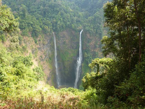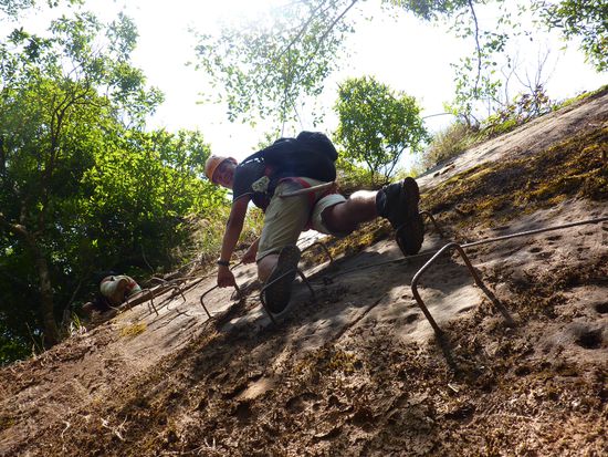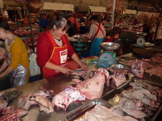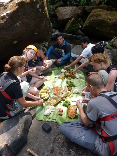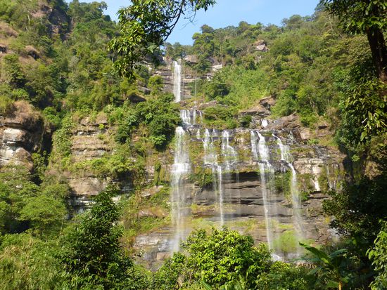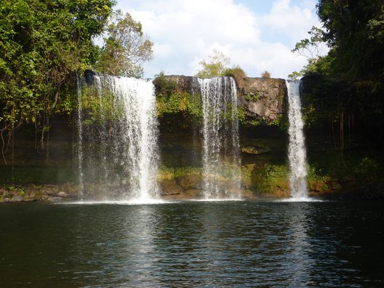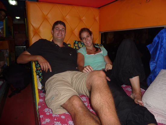 Ein Minivan holte uns pünktlich ab und brachte uns zum Sleeperbus, welchen wir dann gespannt beäugten. Und wir waren positiv überrascht!! Tatsächlich hatte man Platz zum Liegen und es war dazu auch noch ziemlich bequem. Wir fanden beide etwas Schlaf und somit ging die Fahrt auch relativ rasch vorbei. Ziemlich pünktlich nach elf Stunden erreichten wir frühmorgens Pakxe. Eine Bleibe konnte auch schnell gefunden werden. Wir ergatterten im Lankham Hotel ein tolles Zimmer, welches wohl vor kurzem frisch renoviert wurde. Anschliessend mieteten wir ein Fahrad um die Gegend bequem zu erkunden. Natürlich besuchten wir auch wiedermal zwei Märkte. Dem einen, welcher über eine gigantische "Fleischabteilung" verfügte, statteten wir einen längeren Besuch ab. Aber es war schon seltsam Schweineköpfe, Büffelschwänze und andere undefinierbare Fleischstücke zu besichtigen. Aber interessant fanden wir's natürlich beide! Am Abend gingen wir am Mekong in ein einheimisches Restaurant. Jedoch wollte man uns das Essen wohl nicht zutrauen. Naja, bekamen wir hält nur ein Bier! Natürlich haben wir anschliessend an einem anderen Ort was zu Essen erhalten. Zum Glück, sonst hätte Pascal keinen schönen Abend mit mir gehabt! Gleich für den nächsten Tag buchten wir den Zweitagestrip von Green Discovery, welcher uns durch Familie Torgler empfohlen wurde. Dieser sollte Ziplines, Trekking und Klettern beinhalten. Mit einem Minivan fuhr man zuerst ca. 1.5 Stunden zum Startpunkt fürs Trekking. Dort wurde auch gleich die Ausrüstung für die Ziplines montiert. Nach kurzem Wandern wurde auch schon der erste Wasserfall erreicht, wo auch der Zmittag eingenommen wurde. Nach kurzem Aufstieg erreichten wir anschliessend die erste Zipline. Natürlich hat es wieder super viel Spass gemacht. Die Landschaft war der Oberhammer, sodass man während dem Zippen nicht wusste wo man alles hinschauen soll. Nach einigen Ziplines haben wir nachmittags auch das Camp erreicht, in welchem wir dann auch die Nacht verbrachten. Zuerst konnten wir aber beim anliegenden Wasserfall eine verdiente Abkühlung nehmen. Sogar Pascal traute sich ins kühle Nass! Für unsere Gruppe, welche aus zwei Holländer, zwei Israelis und uns bestand, wurde abends ein feines Nachtessen gekocht. Anschliessend wurde innerhalb der Gruppe noch fleissig Erfahrungen, Geschichten u.ä. geteilt, bis uns kurz vor neun der Reiseleiter ins Bett schickte. Pro Paar stand ein Baumhaus zur Verfügung, welches nur mit einer Zipline erreicht werden konnte. Jedes Zimmer war auch mit fliessendem Wasser und sogar einer Toilette ausgerüstet. Die Nacht fast unter freiem Himmel haben wir beide als sehr angenehm empfunden, obwohl es wieder getrennte Betten waren. Mit dem Unterschied, dass dieses mal auch mein Bett frei von Bettwanzen war! Nach einem leckeren Frühstück ging es wieder zu den Ziplines. Dieses Mal standen zwei ca. 400m lange Ziplines zur Verfügung, welche wir alle je dreimal runterflitzten. Anschliessend galt es den ersten Teil des Aufstiegs zu bewältigen. Ein weiterer Teil wurde sogar per Klettern bezwungen. Dies brauchte doch ein wenig Überwindung, da es teilweise nicht ohne war. Aber wir haben es beide natürlich bestens gemeistert. Anschliessen kehrten wir zu unserem Minivan zurück, um uns in erschöpft in die Sitze fallen zu lassen. Der Ausflug hat uns beide super gefallen und wir können ihn nur weiterempfehlen. Die ganze Landschaft, welche wir in diese zwei Tagen wieder gesehen haben war überwältigend. Und der Spass kam auf dem Ausflug auch keineswegs zu kurz. Am Abend trafen wir uns noch mit der Reisegruppe dieses Ausflugs zum Abendessen. Jedoch schlüpften wir an diesem Abend schon früh unter die Bettdecke. Am nächsten Tag mieteten wir uns wieder mal ein Roller und Pascal konnte sich wieder mal als Fahrer eines Semiautomatik-Rollers beweisen. Unser Plan zuerst auf dem Bolaven-Plateau den Mister Coffe besuchen, um einen echten laotischen Kaffee zu probieren, ging leider nicht auf, da dieser natürlich genau an diesem Tag keine Lust zu arbeiten hatte. Naja, tranken wir halt eine Cola, sind ja eh nicht die grossen Kaffeetrinker! Anschliessend besuchten wir die Wasserfälle Tad Fan und Tham Champee. Beim zweiten Wasserfall (Tham Champee) konnten wir sogar noch eine wohltuende Abkühlung nehmen. Einheimische Kinder zogen uns mit einem Floss bis hinter den Wasserfall, was uns riesen Spass bereitete. Der erste Zwillings-Wasserfall konnte nur aus der Ferne besichtigt werden. Dieser war jedoch mit seiner gigantischen Höhe (über 150 Meter) unglaublich schön anzusehen. Danach fuhren wir wieder zurück nach Pakxe, um uns in einem Restaurant per Liveticker über das Tennisspiel Federer-Murray zu informieren. Leider hatte es ja für Federer nicht gereicht. Nach einem Frustbier von Päsci verbrachten wir aber doch noch einen friedlichen Abend in Pakxe. Morgen soll uns ein Minivan innerhalb 2.5 Stunden auf die Insel Don Det (4000 Inseln) bringen. Sind wir mal gespannt, ob uns jemand abholt.