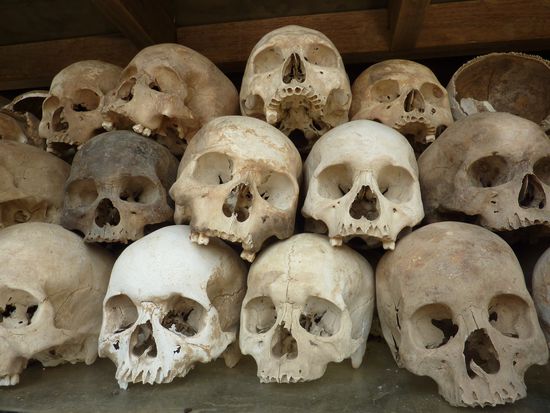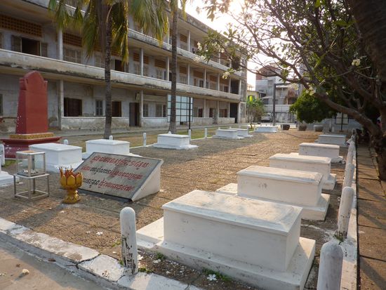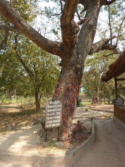 Wir liessen uns zunächst zu den Killingfields chauffieren, die etwa 40 TukTuk-Minuten vom Zentrum entfernt lagen. Dort erlebten wir zwei interessante aber doch sehr bedrückende Stunden. Noch keine 35 Jahre ist es her, als an diesem Ort täglich Hunderte oder am Schluss sogar Tausende Menschen hingerichtet wurden. Hingerichtet durch eigene Landsleute, die der Roten Khmer "gefährlich" werden konnten. Leute, welche die vergangene Regierung unterstützten, Leute mit Bildung oder einfach Leute die eine Brille trugen. Insgesamt wurden in diesem Krieg von acht Millionen Kambodschanern deren drei Millionen exekutiert! Am Eingang dieser Killingfields bekommt man einen Audio-Guide, welcher wirklich sehr zu empfehlen ist. Auf dem ganzen Gelände sind noch Kleider- und Knochenstücke zu finden, welche durch den Regen immer mal wieder freigegeben werden. Trauriger Höhepunkt ist der sogenannte Killing-Tree an welchem kleine Kinder kopfüber aufgehängt und an den Baum geschlagen wurden. Da für die Rote Khmer eine Hinrichtung durch Erschiessen zu teuer war, wurde die Gefangenen durch selbst gebastelte Werkzeuge regelrecht zu Tode gefoltert. Bei diesen Killingfields blieben sogar mir dumme oder sarkastische Sprüche im Hals stecken. Es war ein sehr beklemmendes Gefühl und sogar beim Schreiben dieser Zeilen läuft es mir kalt den Rücken runter.