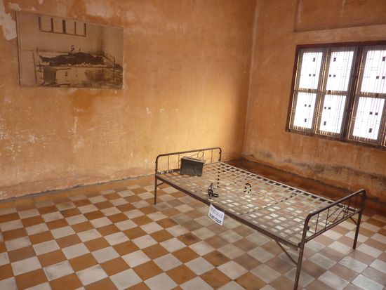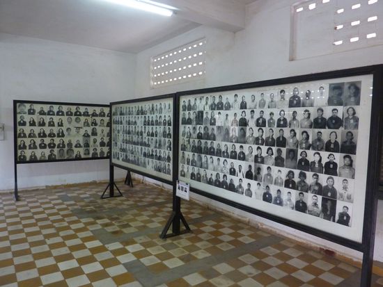 Nach dieser willkommenen Abwechslung besuchten wir noch das ehemalige Gefängnis S-21, einem weiteren düsteren Kapitel in der Geschichte Kambodschas. Bevor viele Kambodschaner zu den Killingfields transportiert wurden verbrachten einigeTage, Wochen oder sogar Monate in diesem Gefängnis. Die Zellen waren zum Teil nicht grösser als eine Matratze und beinhalteten als "Toilette" eine leere Munitionsbox. Neben diversen Gefängniszellen sind auch hunderte Bilder ehemaliger Häftlinge ausgestellt. Darunter auch viele Fotos von Kindern oder auch Häftlingen, welche die Misshandlungen nicht überlebten. Es fehlen einem die Worte das Gesehene zu beschreiben. Als wäre das noch nicht genug gewesen, fragte uns ein anderer TukTuk-Fahrer ob wir noch eine Pistolen-Fabrik besuchen und auch Maschinengewehr schiessen möchten... Wie ein Schlag ins Gesicht, nachdem man total deprimiert dieses Gelände verlässt.