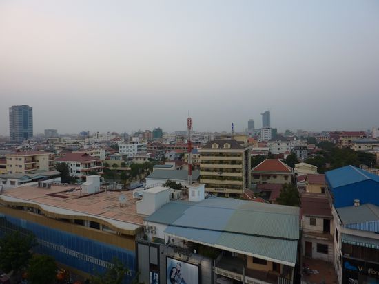 Da wir aber diese wirklich schöne Stadt in guter Erinnerung behalten wollten, verabredeten wir uns mit Lea und Lucie in der Skybar, um den Sonnenuntergang zu bestaunen. Mit der Hilfe von dutzenden wirklich hilfsbereiten Kambodschanern fand unser Fahrer sogar diese Bar. Vom Sonnenuntergang war zwar genauso wenig zu sehen wie von den beiden Mädels, dafür wurden wir von ein super Ausblick über die Stadt entschädigt.