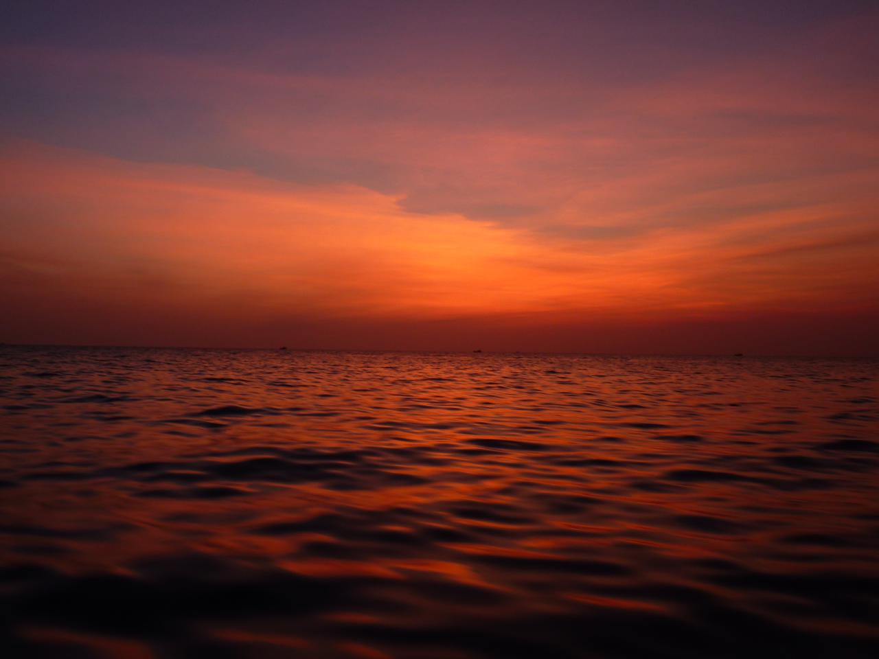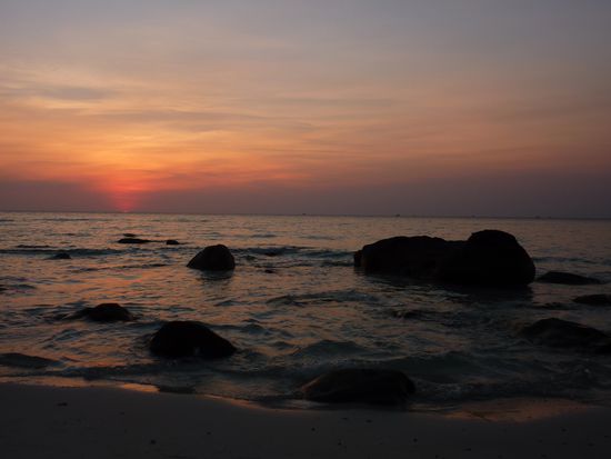Nach zwei Tagen war uns dieser wunderschöne Strand aber nicht mehr gut genug und wir durchquerten in brütender Hitze über einen Hügel und durch dicken Dschungel die Insel. Auf der anderen Seite angekommen, konnten wir unseren Augen nicht mehr trauen. Ein sieben Kilometer langer, feinsandiger Sandstrand. Das Meer türkisblau und doch fast durchsichtig. Und dazu noch fast menschenleer. Wir waren definitiv im Paradies angekommen!! Ein Ort wie aus dem Bilderbuch und fast nicht in Worte zu fassen! Schnell waren wir uns alle einig, dass auf einer Skala von 100% lediglich für die fehlenden Palmen ein Abzug von einem Prozent gegeben wird. Am Nachmittag wurde das zwar durch die lästigen Strandfliegen (Jasmin wurde an einem Bein etwa 19 Mal gestochen) etwas revidiert. Nach einem ebenso schönem Sonnenuntergang waren Jasmin und ich uns einig auch den letztenTag auf der Insel dort verbringen zu wollen. An unserem zweitenTag fanden gerade mal noch 20 Leute den Weg an diesen Strand! Jedes weitere Wort wird dem Ort aber nicht gerecht, lassen wir doch lieber Bilder sprechen. Den Fussweg zurück konnte man sich übrigens durch ein Boot für 3 Dollar pro Person ersparen.