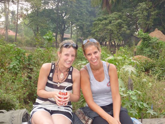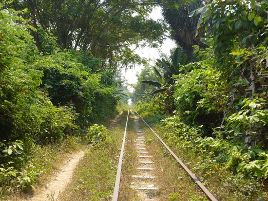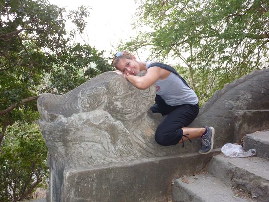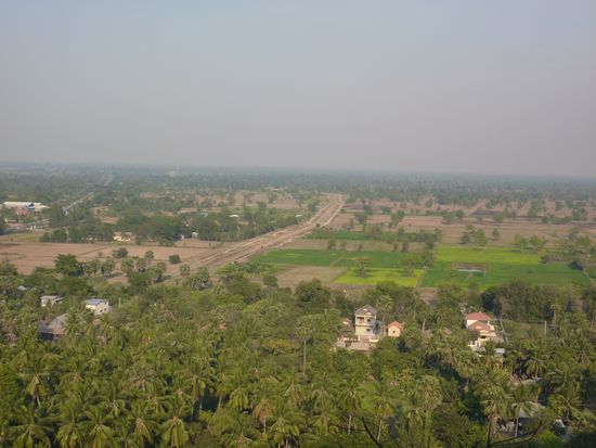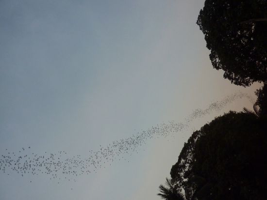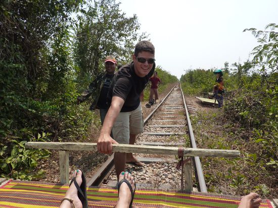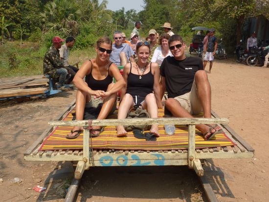 Nach einer angenehmen dreistündigen Busfahrt erreichten wir das kleine Städtchen Battambang. Bei der Ankunft wurden wir von den Tuk Tuk Fahrern fast überrannt. Wir mussten uns das Lachen ziemlich verkneifen, da uns alle zu ihrem bestem Hotel bringen wollten. Schlussendlich haben wir uns für denjenigen Fahrer entschieden, welcher uns zum Hotel Royal brachte, was sich als eine gute Unterkunft erwies. Nachdem wir uns noch die Bäuche vollschlugen mit einem Zmittag im Dachrestaurant des Hotels, liessen wir uns vom Tuk Tukfahrer zu einem Ausflug zur einer Höhle überreden. Zuerst erklimmten wir den Tempel auf dem Berg, welcher sich über zahlreiche Treppen erreichen liess. Kurz vor dem Sonnenuntergang setzten wir uns vor einen Höhleneingang, um die herausfliegenden Fledermäuse zu beobachten. Es mussten Millionen von Fledermäusen gewesen sein, welche während über zehn Minuten aus der Höhle geflogen sind. Somit legte sich unsere Nervosität, keine Zeit für ein perfektes Foto zu haben, sehr rasch wieder. Es war einfach unglaublich!!! Und dies wiederholt sich jeden Abend, wenn die Fledermäuse ausfliegen, um sich von Mücken oder ähnliches ein Festmahl zuzubereiten. Wir alle drei waren total fasziniert. Als das Spektakel vorbei war, fuhren wir wieder zum Hotel zurück, um auch noch meinen knurrenden Magen zu beruhigen, bevor es dann auch schon bald Zeit fürs Bett war. Am nächsten Tag entschieden wir uns den Bambootrain zu testen. Hier handelt es sich um ein Konstrukt aus Bambushölzern, auf welchen man sich platzieren und von einem Fahrer während 30 Minuten zu einer Backsteinherstellung fahren lassen konnte. Natürlich wurde diese kurz besichtigt und nach einer wohltuenden Erfrischung machten wir uns auch wieder auf den Rückweg. Die Fahrt bot zwar keine allzu spezielle Landschaft, jedoch war die rasante Fahrt selbst schon ein Highlight. Anschliessend fuhren wir zurück zum Hotel, um anschliessend die Gegend und die Weiterreise zu planen. Es wurde ein Bus nach Bangkok gebucht, mit der Hoffnung frühmöglichst anzukommen, um noch direkt weiter nach Kanchanaburi fahren zu können. Dort wollen wir uns den Erawan Nationalpark zu Gemüte führen. Die Fahrt nach Bangkok sollte sieben Stunden dauern.