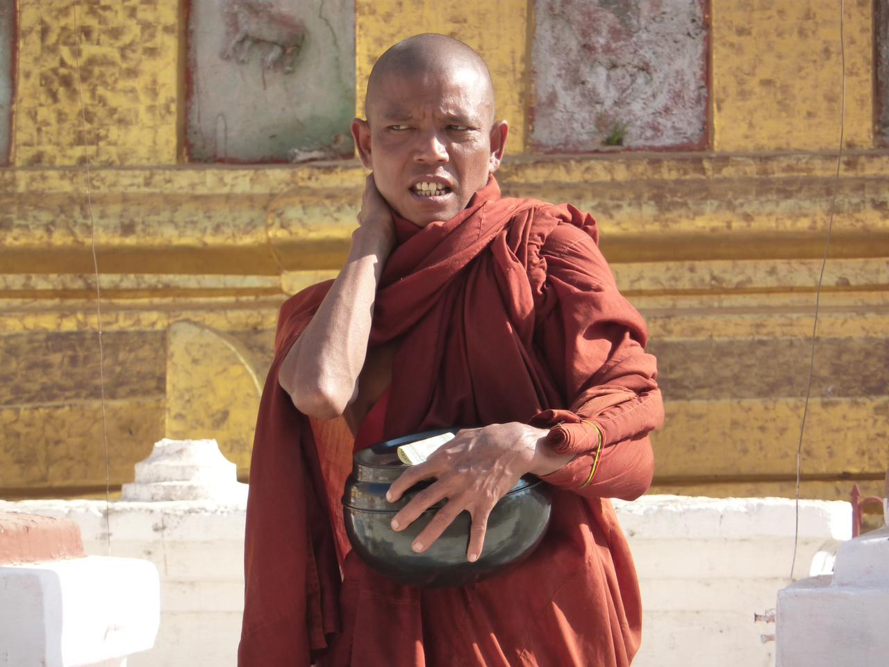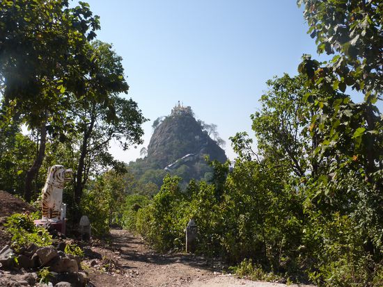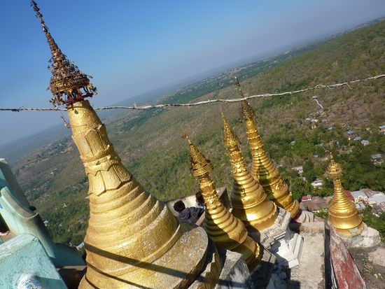 Am letzten Tag in Bagan stand ein Besuch beim Mount Popa auf dem Programm. Wir begnügten uns allerdings damit, den "kleinen Bruder" Popa Taung Kalat, einer der wichtigsten Wallfahrtsorte Myanmars, zu erklimmen. Über 777 Treppen, vorbei an unzähligen Affen und schwer keuchenden Touristen gelangt man auf den Gipfel. Die Aussicht da oben war wirklich super. Am frühen Nachmittag waren wir von dieser Tour bereits wieder zurück. Als krönenden Abschluss wollten wir uns noch einen Sonnenuntergang zwischen den Pagoden angucken. Dafür heuerten wir den erstbesten Pferdekutscher an, welcher uns zunächst noch zwei weitere Tempel zeigen wollte. Wir staunten nicht schlecht als nach dem ersten Monument von unserem Kutscher weit und breit nichts mehr zu sehen war. Naja, wir hatten ja noch nichts bezahlt und würden bestimmt eine Alternative finden. Wir staunten jedoch noch viel mehr, als wir unsere Kutsche samt Pferd und Reiter im Strassengraben wieder fanden. Mit vereinten Kräften ist es dann gelungen das Gespann aus der misslichen Lage zu befreien. Das führte zur skurrilen Situation dass der ursprüngliche Reiter nebenher laufen musste und ein zufällig anwesender Rollerfahrer plötzlich die Zügel in den Händen hielt Ob das Ganze tatsächlich auf die Müdigkeit des Pferdes oder doch auf den offensichtlichen Alkoholkonsums des Kutschers zurückzuführen ist wird wohl immer ein Geheimnis bleiben Trotz allem durften wir einen schönen Sonnenuntergang und einen ebensolchen Abschluss von Bagan erleben!