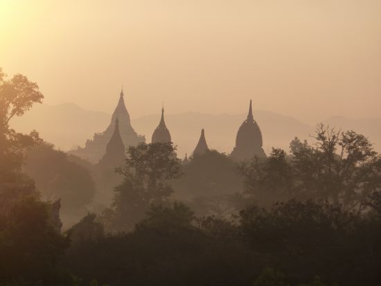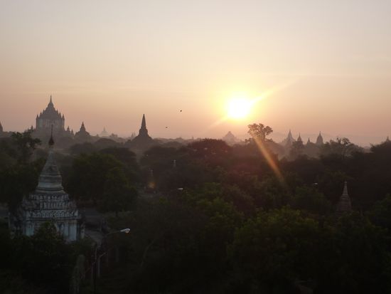 Am zweiten Tag klingelte uns der Wecker bereits um 05.00 Uhr aus dem Schlaf, wollten wir uns doch einen Sonnenaufgang über den Pagodenfeldern nicht entgehen lassen. Den von uns angepeilten Tempel konnten wir im Dunkeln natürlich nicht finden und so waren wir froh von einem "zufällig" anwesenden Birmanen auf eine tolle Pagode mit super Sicht geführt worden zu sein. Von da oben bot sich mit den ersten Sonnenstrahlen eine unbeschreibliche Aussicht auf unendlich scheinende Felder mit unzähligen Pagoden! Einfach ein Moment um innezuhalten und den Augenblick zu geniessen.