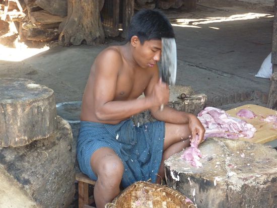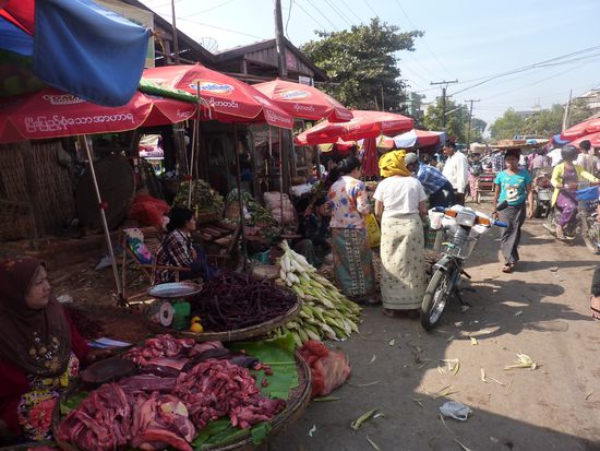 Den dritten Tag in Mandalay verbrachten wir vornehmlich am Markt und durch die Gassen schlendernd, da unser Bus nach Kalaw erst abends fuhr. Leider viel zu spät lernten wir dabei den Tour-Guide KoMgOo kennen welcher ganz gut englisch sprach. Da er an diesem Tag Geburtstag feierte lud er uns spontan zu einem Tee und einheimischen Spezialitäten ein. Nachdem wir den Preis für die Fahrt zum Busbahnhof selber bestimmen konnten beschenkte er uns noch mit frischen Bananen. Zu guter Letzt wartete er noch über eine halbe Stunde auf die Abfahrt unseres Busses und erzählte uns allerhand interessantes aus dem Leben eines Birmanen.