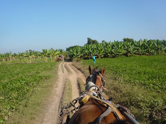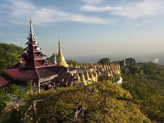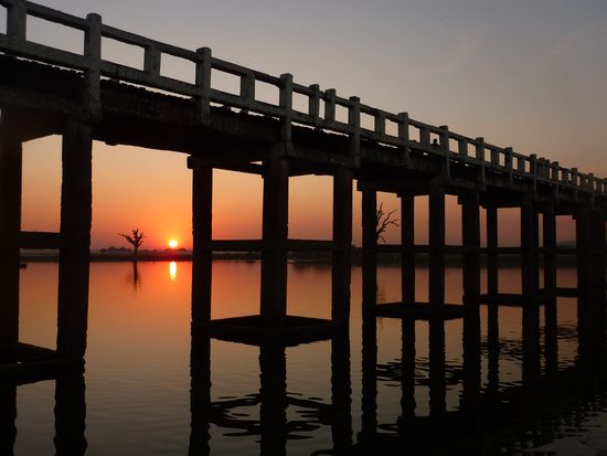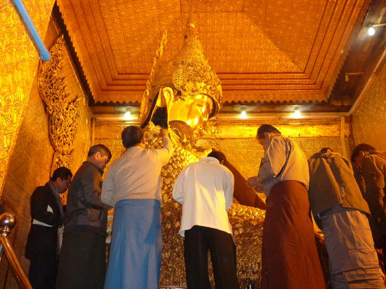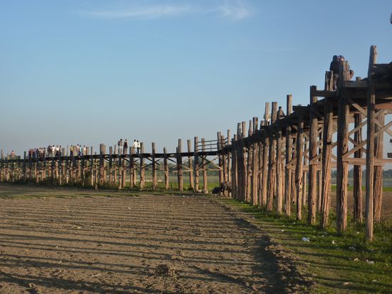 Am zweiten Tag sollte uns ein Chauffeur weitere Sehenswürdigkeiten in Mandalay und der Umgebung zeigen. So besuchten wir beispielsweise die Mahamuni-Pagode, eine der wichtigsten Pilgerziele Myanmars. Die darin befindliche Bronze-Figur ist so mit Blattgold überzogen, sodass einzelne Körperteile fast nicht mehr zu erkennen sind. Die Goldschicht an der Brust soll bereits 35 cm dick sein! In Amarapura konnte einer Massenspeisung Hunderter junger Mönche beigewohnt werden. Die Szene glich aber eher einer Tier-Fütterung im Züri-Zoo. Fast ein Wunder bediente sich niemand aus dem Essenstopf. Obwohl, das wäre eher Jasmins Aufgabe gewesen - In Inwa führte uns eine Pferdekutsche nochmals zu einigen Pagoden, wobei die Fahrt wesentlich mehr Spass machte als die Besichtigungen der Monumente an sich. Den Abschluss des Tages verbrachten wir zum Sonnenuntergang an der U-Bein Brücke. Sie ist mit rund 1.2 km die längste Teakholzbrücke der Welt. Einen frischen Kokosnuss-Saft trinkend genossen wir den Augenblick, auch wenn ich die schönsten Momente beim Anstehen für die Toilette verpasste