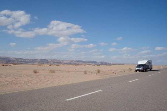 Dann kam (auch pünktlich!) Pascal, und wir fuhren gleich los. Südwärts. Wir wollten die Sonne and we wanted it now. Das Ziel war Aqaba, die südlichste Stadt Jordaniens, am Roten Meer gelegen. Dort, wo einige deutsche Rentner-WoMo-Ehepaare gerne ihre Bäuche bei 25° auf ihren Klapp-Liegestühlen überwintern. Unterwegs kam ein SMS von Donald: "Hoi, ich bin die Donald. Hat mich mega gefreut das ich habe dich kenn gelernt. Wann hasch Zeit rufsch an."