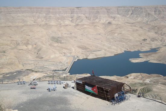 Heute verabschiedete ich mich von den Staumauerpolizisten. Als Aus- zeichnung für meinen Aufenthalt erhielt ich... ein weiteres Jordan-Uniform- Fläggli. Ziel: Mukawir, hoch über dem Toten Meer gelegen. Im Mujib-Supermarkt kaufte ich noch Wasser für die Reise, dann tuckerte ich im ersten Gang die andere Canyon-Seite hinauf.