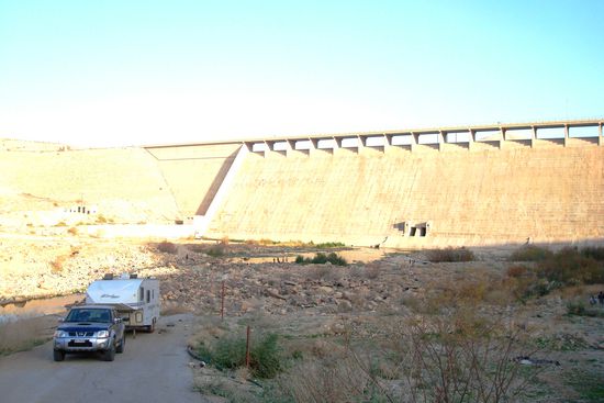 Und jetzt hocke also ich zuunterst im zweiten Canyon. Etwas gar unroman-tisch nahe am Fuss der Staumauer. Aber die kleine Ebene, durch die das verbleibende Flüsschen fliesst, ist very nice. Schilf, Gebüsch, einige kleine, grüne Felder, Schafe, Ziegen und Frösche. Es gibt, ausser der Hauptstras- se über die Staumauer, nur ein Strässchen, das hinunter führt. Es beginnt bei der Staumauer-Police-Station und ist eigentlich gesperrt, weil es unten vor dem Fluss einfach abbricht. Nach fünf Minuten "Welcome"-Wünschen, drei Minuten Verhandlung und einer Viertelstunde Kaffee trinken bekam ich die Erlaubnis hinunterzufahren.