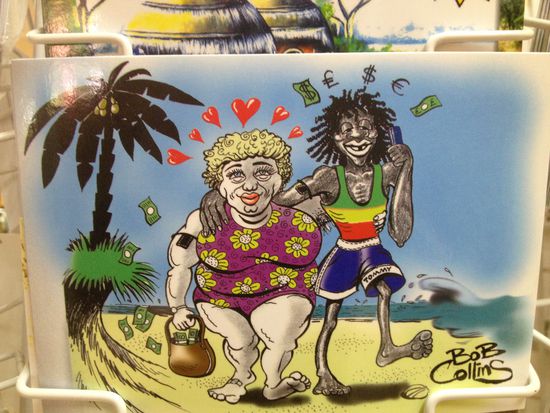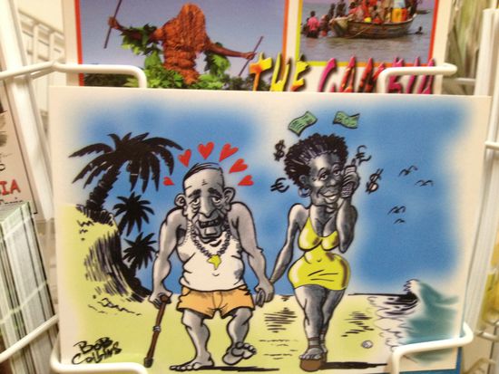 Die Shops befindet sich im ersten Stock. Das Angebot hält sich in Grenzen. Es gibt T-Shirts mit ganz spezifischen Gambia-Aufdrucken, Schnitzereien, Schmuck und dann hab ich in den Postkarten noch diese zwei überaus witzigen Exemplare gefunden: