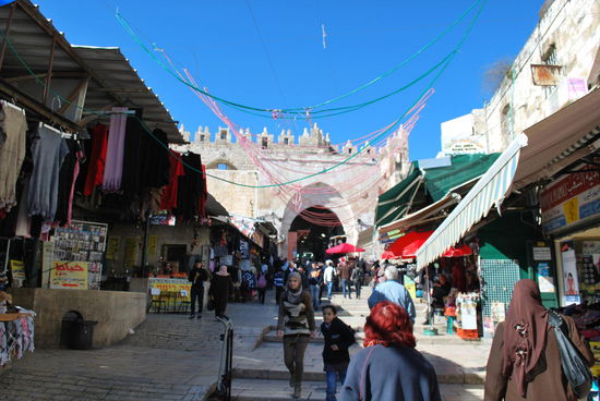 Qattanin Markt - das Tor am Ende ist der Zugang zum Tempelberg und der Felsendom steht gleich dahinter, quasi in Armeslänge. Aber der Durchgang ist gesperrt, wird schwer bewaffnet bewacht und man darf noch nicht einmal die Stufen betreten, da wird man schon scharf zurückgepfiffen. Schon am Anfang der Marktgasse erzählen einem die Leute, dass man da am Ende nicht weiter kommt, deswegen betreten viele die Gasse gar nicht erst.