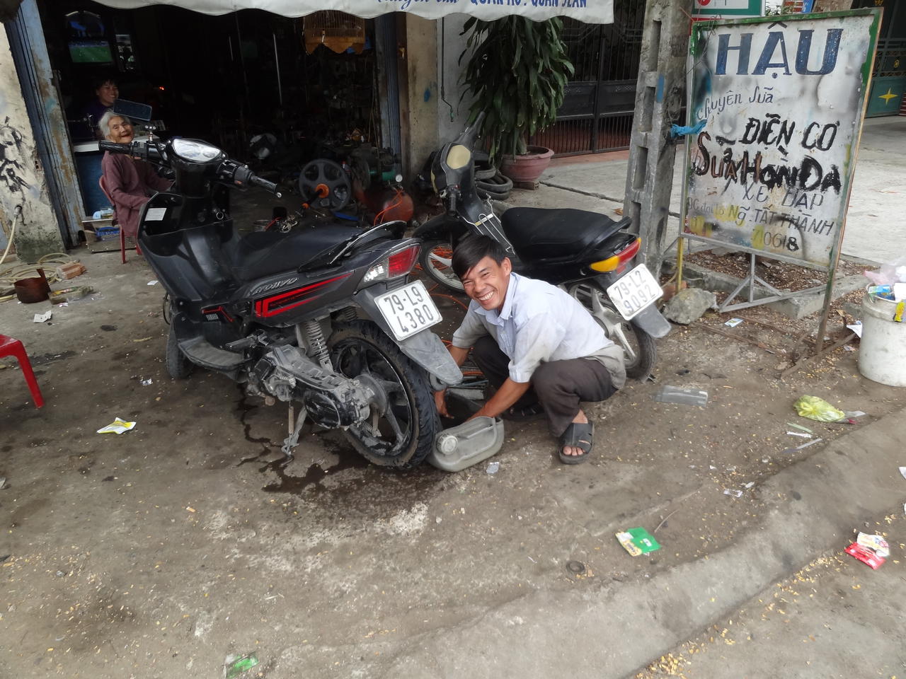 ...und ploetzlich hatten wir einen Platten, aber der wurde auch innerhalb von 10 Minuten wieder repariert und das fuer umgerechnet 20.000 Vietnam Dong, das sind 0,72 Euro. Wir gaben 40.000 VD und ein Tigerbier!