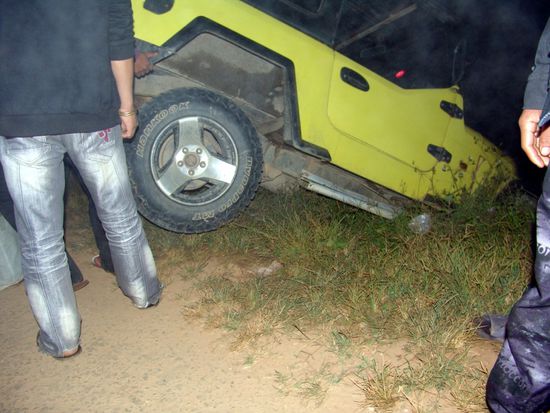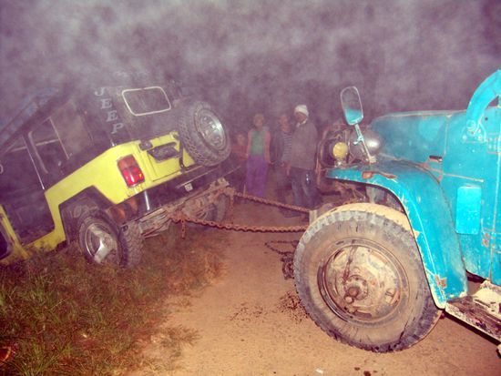 Unterwegs hatten unsere 6 Fahrzeuge nur drei mal eine platten Reifen! Kurz vor Kampalat, unser heutiges Uebernachtungs Ziel, erreicht uns die Nacht mit dickem Nebel. Unser Chauffeur, welcher kein englisch spricht, verfährt sich und muss nach dem Weg fragen, was auch hier mit grossen sprachlichen Schwierigkeiten verbunden sind. Beim Wendemanöver fährt unser Fahrer statt rückwärts geradewegs über den Strassenrand hinaus. Unser Auto bleib jedoch auf der Kante auf der Kippe stehen. Vorne und hinten sind die Räder in der Luft und wir wagen fast nicht mehr zu atmen, da wir nicht wissen ob sich das Auto in den 10 m tiefen Abgrund überschlägt! Mit viel Schutzengel-Kraft kann Peter auf dem Vordersitz die Türe öffnen und rauskriechen. Hinter dem Auto helfen im 3 Männer das Auto an der Stossstange nach unten zu drücken, so dass wir Zwei auf dem Hintersitz nach vorne klettern können und ebenfalls auszusteigen wagen!