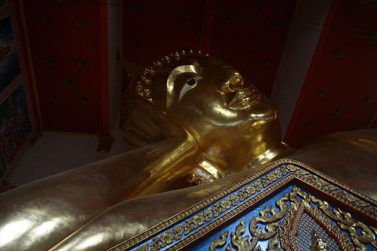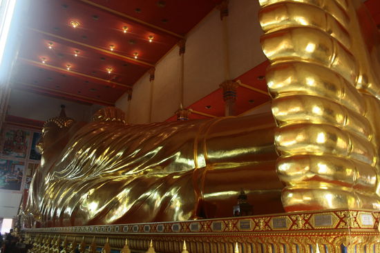 Jana: Der Tempel ist klein und nicht so bekanntl, jedoch trotzdem sehenswert. Roland sagte uns, dass hier der grösste liegende Buddha in Bangkok sei.
