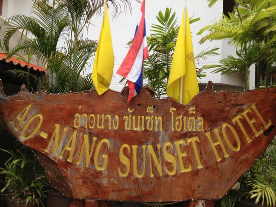 Nach einigem Suchen - es ist schon bald Songkran - finden wir ganz in der Nähe das Ao Nang Sunset Hotel, in dem noch ein Zimmer frei ist. Es ist klein, preiswert, zentral gelegen. Also buche ich die zwei nächsten Nächte gleich dort.