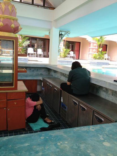Wieder zurück, kommen wir an der Poolbar vorbei. Wir beschliessen, hier einen Drink zu bestellen. ABER: Wir glauben unseren Augen nicht zu trauen! Eines der Mädchen sitzt am Boden, den Kopf auf den Knien - sie scheinz zu schlafen und die andere sitzt auf dem Tresen und bearbeitet ihre Füsse.