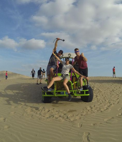 Um ihnen den Schock einer 20 Stunden Fahrt zu ersparen fuhren wir die Strecke nach Cusco auf zwei Etappen aber an einem Tag. Die Erste ging nach Ica, um genau zu sein nach Huacachina. Das hieß um 05:00 aufstehen, rein in den Bus, fünf Stunden Richtung Süden nach Ica fahren aussteigen, Taxi aufreißen, 15 Minuten nach Huacachina fahren, rein ins Hostel (wo wir die Buggy Tour gebucht hatten), Gegend erkunden und um 16:00 ging es schon los mit dem Buggy. Raus aus der Oase und rauf auf die erste Düne hipiiiiiiiiiiiiiiiiiie a yipieeeeeeeeeeee gg um danach gleich bei gefühlten 35 bis 40% Gefälle auf der anderen Seite mit Karacho runter zu fahren. Nachdem wir eine Weile auf den Dünen herum gefahren sind stoppte der Fahrer und wir hatten Gelegenheit ein paar echt gute Fotos zu machen. Währenddessen holte der Fahrer Sandboards aus dem Buggy und wir fuhren ein Stück wie mit einem Snowboard eine Düne hinunter, was jedoch wenig Sex hatte und so versuchten wir unser Glück auf dem Brett liegend mit dem Kopf voraus ........................... und das war schon vieeeeeeeeeeel besser. Mit der Steilheit und Länge der Dünen stieg auch das Unfallrisiko, da der Speed natürlich auch immer höher wurde. Ich sage nur eines, Flo musste zumindest nicht ins Spital, wir konnten ihn selbst versorgen haha.