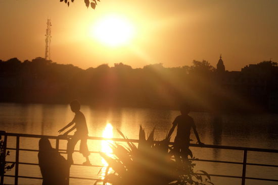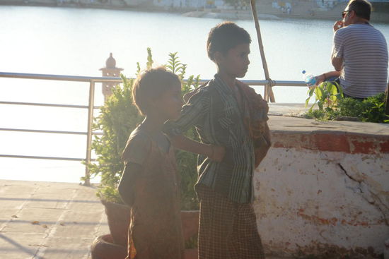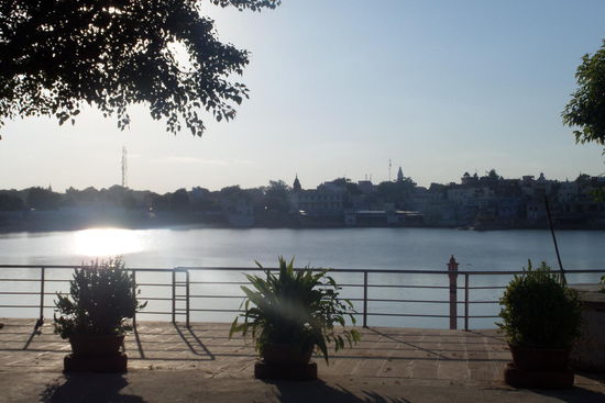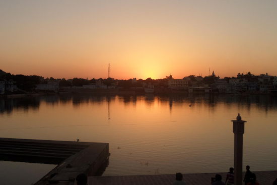 Am Abend gingen wir zum Aussichtspunkt, um uns den Sonnenuntergang anzusehen. Dieser liegt am östlichen Ufer des Lake Pushkar. Wir setzten uns ins Café und es lohnte sich sehr. Romantische Stimmung kam natürlich nicht auf, denn natürlich wussten die Menschen wo die 20 Touris im Ort am Abend hingehen.
