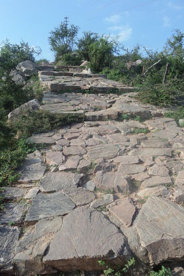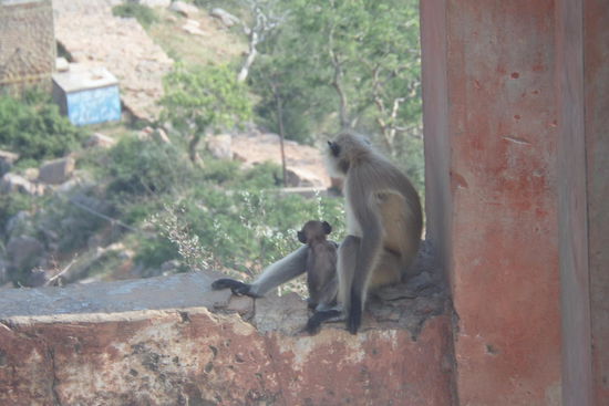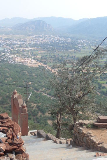 Am nächsten Morgen ging es daher gleich zum nächsten Tempel. Dieser liegt auf einem Berg und der Weg hoch ist schon eine kleine Herausforderung. Noch dazu sind wir ein bisschen zu spät losgegangen, so dass es ziemlich heiss war (etwa 9:30 Uhr). Aber es lohnte sich und die Inder und wir pushten uns gegenseitig. Das war echt witzig. Außerdem halfen wir uns gegenseitig durch das Spalier aggressiver Affen, die auf Plastiktüten und dessen Inhalt scharf waren. Manche Menschen lernen es aber auch gar nicht. Ein Indier musste sein Hab und Gut hinterher in den Sträuchern am Abhang suchen gehen...