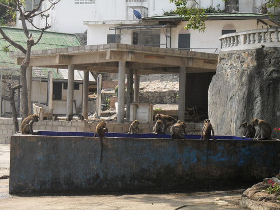 Dann haben wir uns jeder einen Roller gemietet, bis morgen abend, fuer 300 Bht p.P. - und dann gings los: Wir sind zu einem Wat (Tempel) gefahren, dem Khao Takiab, auf einem Berg, wo es wilde Affen geben sollte. Und da der Flo ja Affen so toll findet, haben wir gehofft, dort ein paar zu sehen: aber was wir da erlebt haben, koennen wir eigentlich in diesem Bericht kaum beschreiben. Es waren Horden von Affen!!!! Egal wo man hingeschaut hat - auf den Baumen, Daechern, Treppen...ueberall. Also, wir sind ja nicht ganz dumm, haben wir schoen unsere Tasche zugeknotet, damit die Affen auch an nichts rankommen. Doch Flo meinte, sich eine Flasche Cola kaufen zu muessen - und die Affen scheinen Cola wohl so toll zu finden wie er; ein paar kleine Affen haben dann versucht, ihm die Flasche aus der Hand zu reissen, haben es aber nur geschafft, am Boden der Flasche zu lecken...