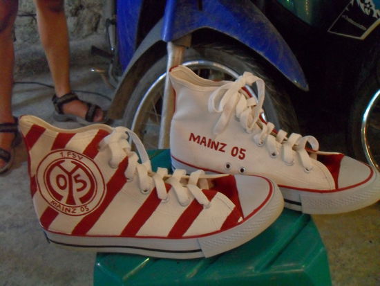Dann haben wir gestern einen Typen auf der Strasse gesehen, der Schuhe bemalt. Egal welches Design man moechte oder welche Idee man hat, malt der Typ das mit Pinsel auf Stoffschuhe! Der Hammer! Und da hat Flo sich natuerlich 2 Paar bestellt, und die konnten wir eben abholen: seht selbst: