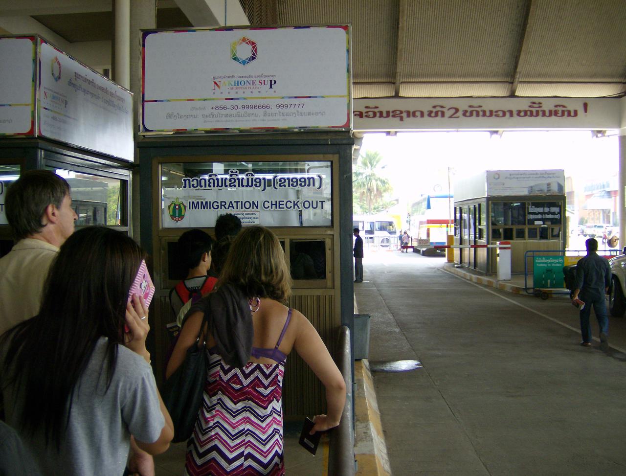 Hier geht's endgültig raus aus Laos, aber erst wenn man die Magnetstreifenkarte über die bezahlte Ausreisegebühr (für Deutsche 0,00 €) dabei hat, sonst nochmal zurück zum entsprechenden Schalter. (Wir hatten sie natürlich NICHT)
