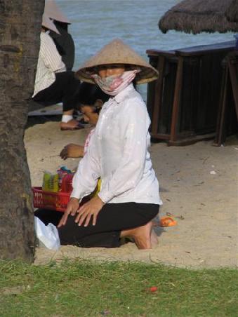Verkaeuferin am Strand mit fast kompletten Sonnenschutz