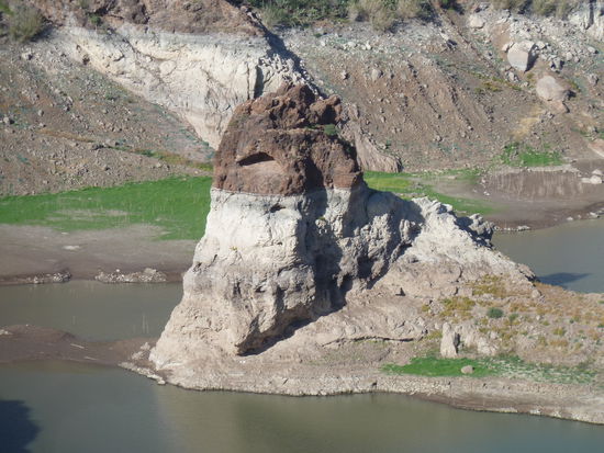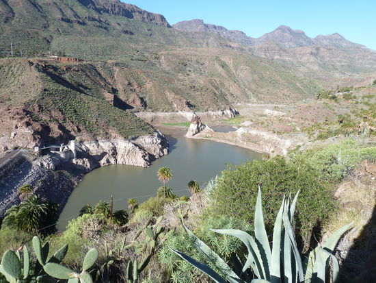 Auf dem Hinweg hat Ulrike von ihrer Seite aus eine eigenartige Felsformation unterhalb gesehen. Bevor wir nach las Palmas aufbrechen, machen wir auch an diesem Mirador La Sorueda kurz Halt. Es handelt sich offensichtlich um eine kleine Talsperre von Ingenion de Santa Luzia - die Presa La Sorueda , die aber wegen des niedrigen Wasserstandes einen Fels mit unterschiedlichsten Farben freigelegt hat.