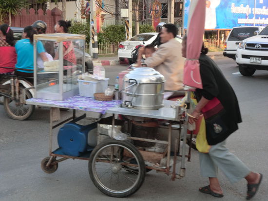 Als ich mein Essen ordern wollte und das Mädchen sicher nur Bahnhof verstand, war am Nachbartisch ein Gast, der meine Wünsche freundlicherweise in Thai übersetzte. Vielen Dank, so mussten wir nicht verhungern. Das Mädchen lächelte aber um so freundlicher und als Exoten wurden wir auch sehr zuvorkommend behandelt.
