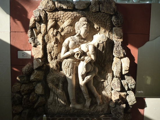 Die Shanti Lodge war dann auch sehr schön. Ich kriegte ein Zimmer für schlappe 950 Baht, mit einem coolen Badezimmer mit einem großen Steinrelief mit Szene aus dem Kamasutra(?). Das Zimmer für die alleinreisende Sextouristin?