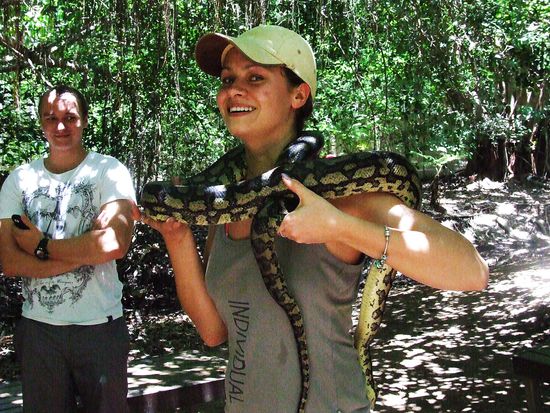 Am gruseligsten war die ca 2m lange Schlange, die wir um den Hals bekommen haben...bloss nicht nervoes werden sonst wirds die Schlange auch... Sie hat sich dann langsam aber sicher um unsere Koerper gewickelt.