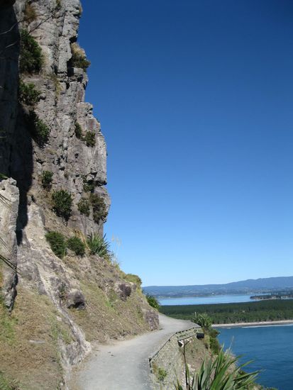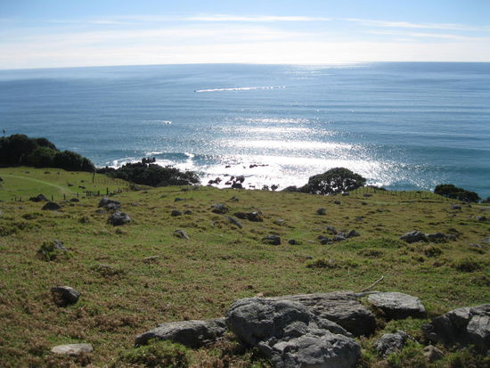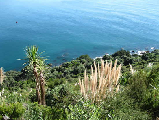 Der Anstieg ist nicht steil und dennoch komme ich ganz schoen ins Schwitzen. nach ca 30 Min Fussmarsch bin ich am Summit angekommen und habe einen ueberwaeltigenden 360 Grad Blick ueber die Umgebung. Es ist - um es mit wenigen Worten zu beschreiben - einfach nur wunderschoen. Nachdem ich die Aussicht habe eine Weile auf mich wirken lassen, gehe ich wieder hinab und bin unten angekommen, bereits schon einmal um den Mt herumgelaufen. es gibt jedoich noch einen zweiten Pfad, den Mauao Base Track, der am Fusse des Mt einmal herumfuehrt. Es ist noch frueher Nachmittag und ich entscheide mich auch diesen Weg zu gehen. Das Meer ist so klar, dass ich bis auf den Grund schauen kann. An manchen Stelle liegen riesige Felsbrocken im Meer, von denen man - dekke ich - super fischen kann. Ich muss schmunzeln, weil ich nur wenige Wochen zuvor sicherlich nicht ans Fischen gedacht haette. Heute faende ich es toll eine Angel dabei zu haben und mein Abendessen zu ergattern.