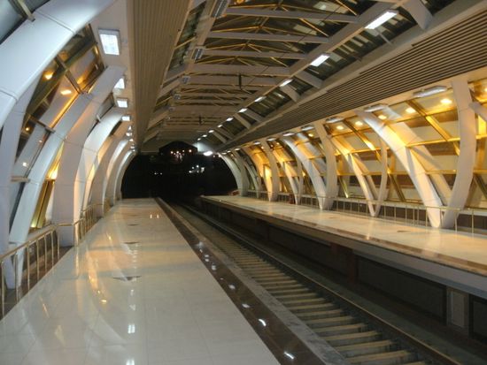 Gegenüber des Flughafens konnte ich auch gleich das futuristische Bahnhofsgebäude des Airport-Train entdecken, der mich als Alternative zum Taxi in das etwa 20 km entfernte Stadtzentrum bringen sollte.