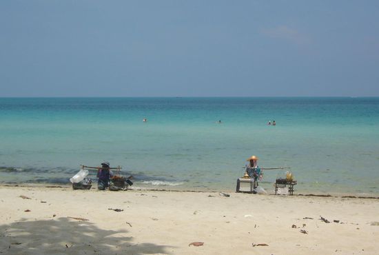 Vier Tage war ich am schönen Menam Beach. Die Bucht von Menam ist 4 Kilometer lang und eingesäumt von hunderten von Palmen. Am westlichen Teil hat sich nicht viel verändert. Die Bungalows der Resorts liegen hier versteckt unter den Palmen. Vor dem Frühstück um 7, 8 Uhr morgens war ich schon im Meer schwimmen. Dann gab es nur den ganzen lieben Tag lesen, Strandspaziergänge, schlafen und wieder schwimmen. Das Palm-Point-Village-Resort ist sehr nett und familiär. Im dazugehörigen Restaurant gibt es einfaches, aber sehr gutes und billiges Essen. Zum Frühstück hatte ich immer frische Früchte mit Joghurt und mit viel gerösteten Erdnüssen und groben Kokosraspeln.