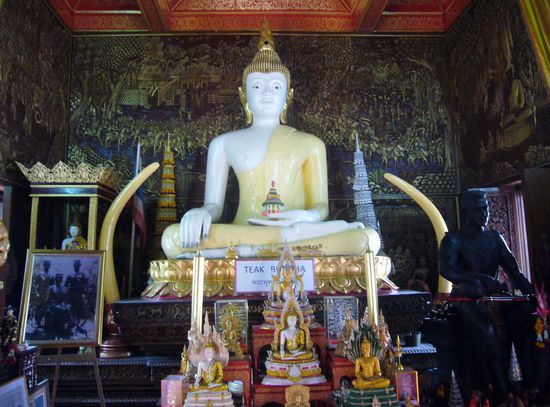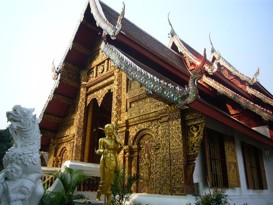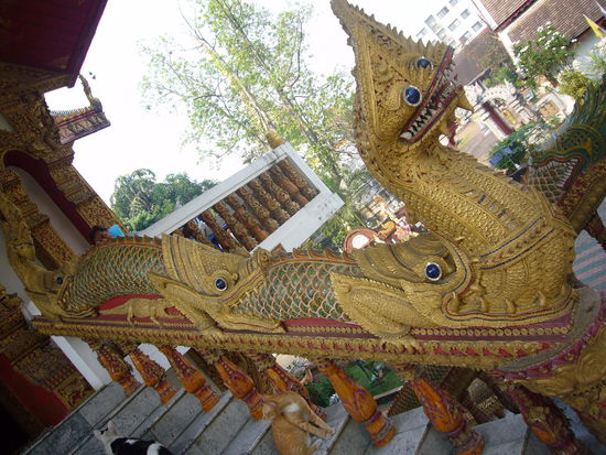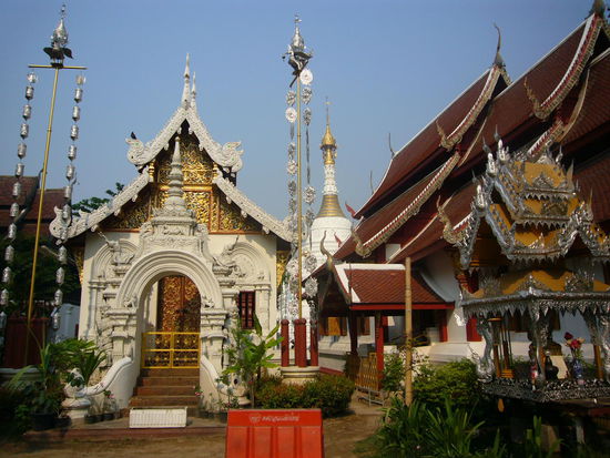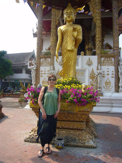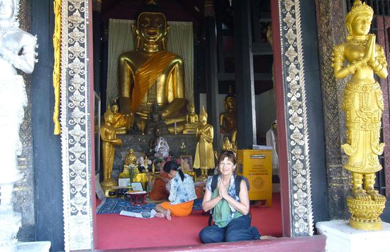 Mein kleines Zimmer im Sabai-Garden ist untertags so heiß, dass ich mich nicht aufhalten kann, aber gottseidank wird es in der späten Nacht wenigstens kühl. Die zweite Nacht war überraschenderweise sehr ruhig. Die schnatternden Nachbarn waren eingesperrt und beim Cocktailbus Low-Season. So bin ich heute sehr früh aufgestanden und habe mich auf den Weg gemacht um mir die Tempel in der City anzusehen. Ich kenne bis jetzt nur die Tempelanlagen in der Altstadt.