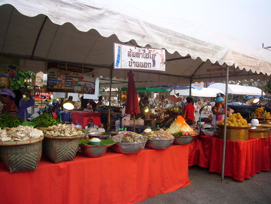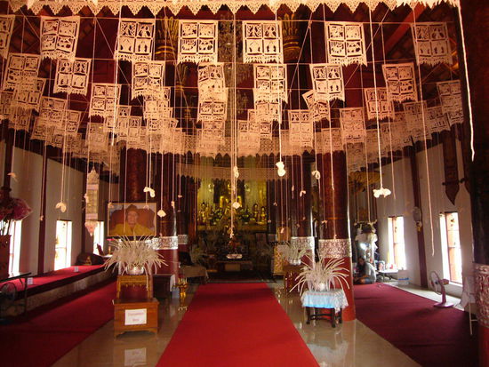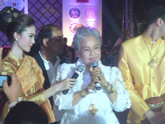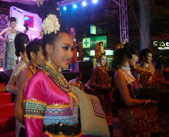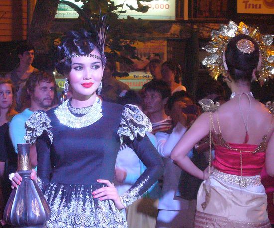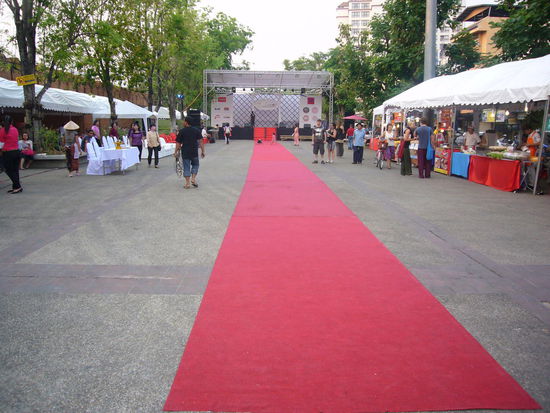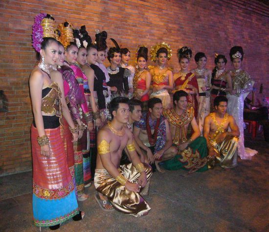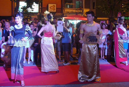 Am Abend war am Platz beim Thapae Gate schon wieder eine Bühne aufgebaut und davor war ein ewig langer roter Teppich ausgelegt. Es waren viele Essenstände mit allerlei Köstlichkeiten aufgebaut. Als es Dunkel wurde begann ein fantastisches Tanztheater auf dem roten Teppich und anschließend eine Fashion-Show, wie aus tausend und einer Nacht. Die schönsten Frauen schritten in wunderbaren Kleidern auf mindestens 15 cm hohen High-Heels und mit teilwese grandiosen Frisurtürmen über den Teppich. Dabei präsentierten sie Kunsthandwerk aus dem hohen Norden. Es gab Ansprachen von wichtig aussehenden Herren und viele Kamerateams waren anwesend. Hofiert wurde auch eine wunderschöne ältere Dame im weißen Spitzenkostüm, die eindringlich zu der Menschenmenge sprach und im Gehen allen zuwinkte. Einer Engländerin und mir ist es leider nicht gelungen herauszufinden wer die interessante Dame war.