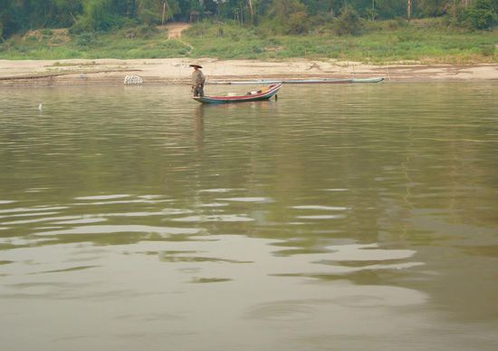 Der Mekong bildet hier die Grenze zwischen Laos und Thailand, durchfließt dann in einer Schleife teils tiefe Schluchten und Stromschnellen das nordwestliche Laos, bis er südlich der Stadt Luang Prabang in einem weiten Flussbett seinen Weg fortsetzt.