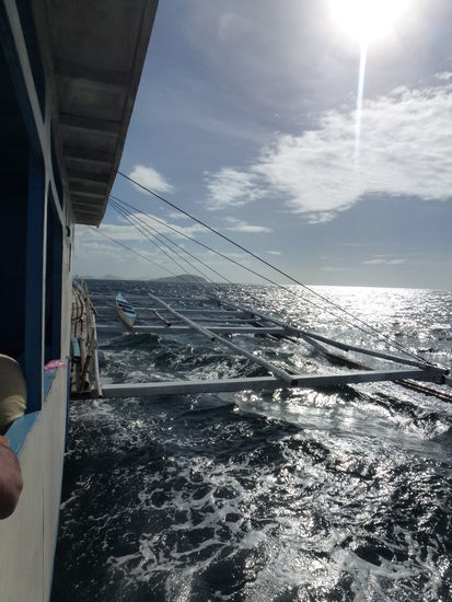 Ein guter Plan für die letzten Tage musste her.... Schnell fiel die Entscheidung auf "Relaxen am Strand". Schlauerweise hatten wir die Visitenkarte der Unterkunft (Orange Pearl Beach Ressort) an Marimegmeg Beach mitgenommen und reservierten dort einen Familyroom für uns. Ein einfaches Zimmer/Bungalow mit 2 großen Betten wurde uns versprochen. Aber erst mussten wir noch die Bootsfahrt von Coron (Busuanga Island) nach El Nido überstehen.....